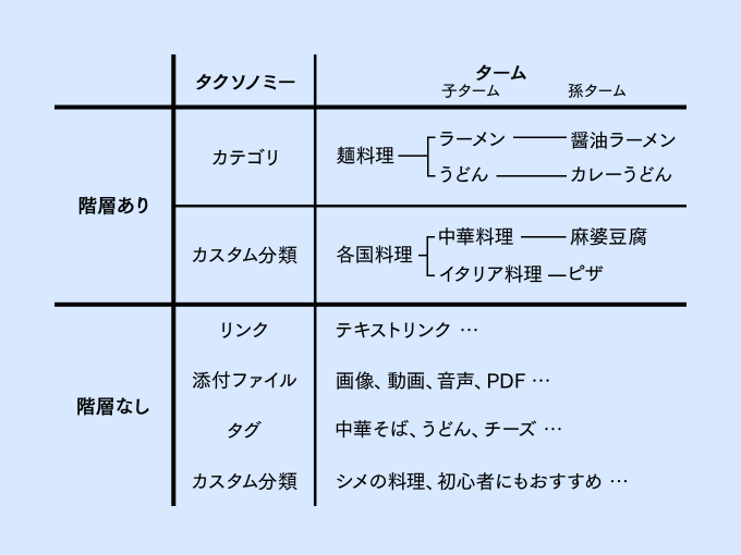 そのものずばり、記事をグループ化する、カテゴライズする、分類する仕組みです。要はおなじみのカテゴリやタグなどのこと。